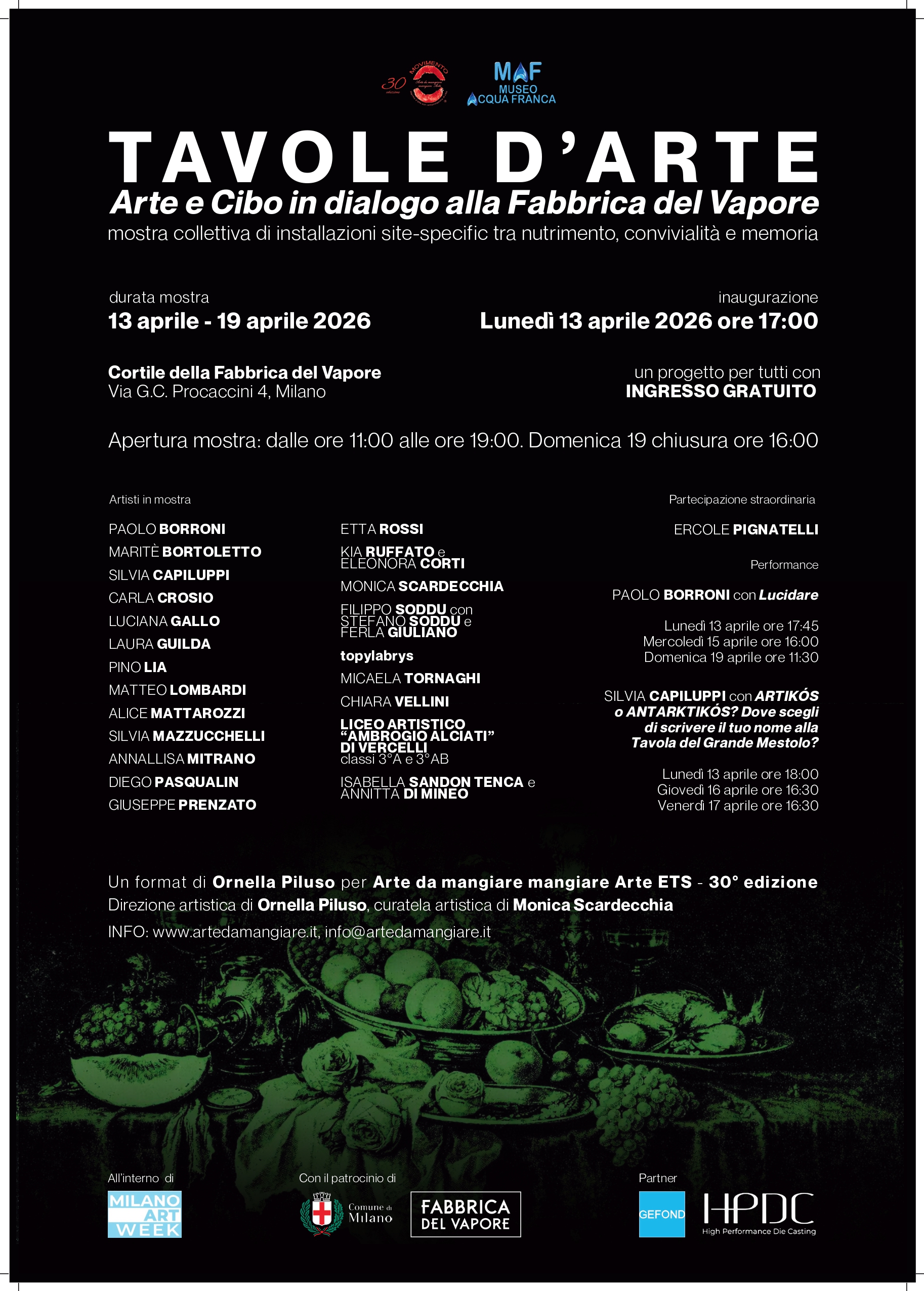 Nel cortile della Fabbrica del Vapore, durante la Milano Art Week 2026, prende forma Tavole d'Arte, mostra collettiva di installazioni site-specific, un progetto con la direzione artistica di Ornella Piluso e la curatela Monica Scardecchia per Arte da mangiare mangiare Arte ETS. Un percorso espositivo immersivo che trasforma il tavolo in campo di indagine: sul cibo come atto sociale, sul nutrimento come gesto affettivo, sulla convivialità nell'epoca della disconnessione.